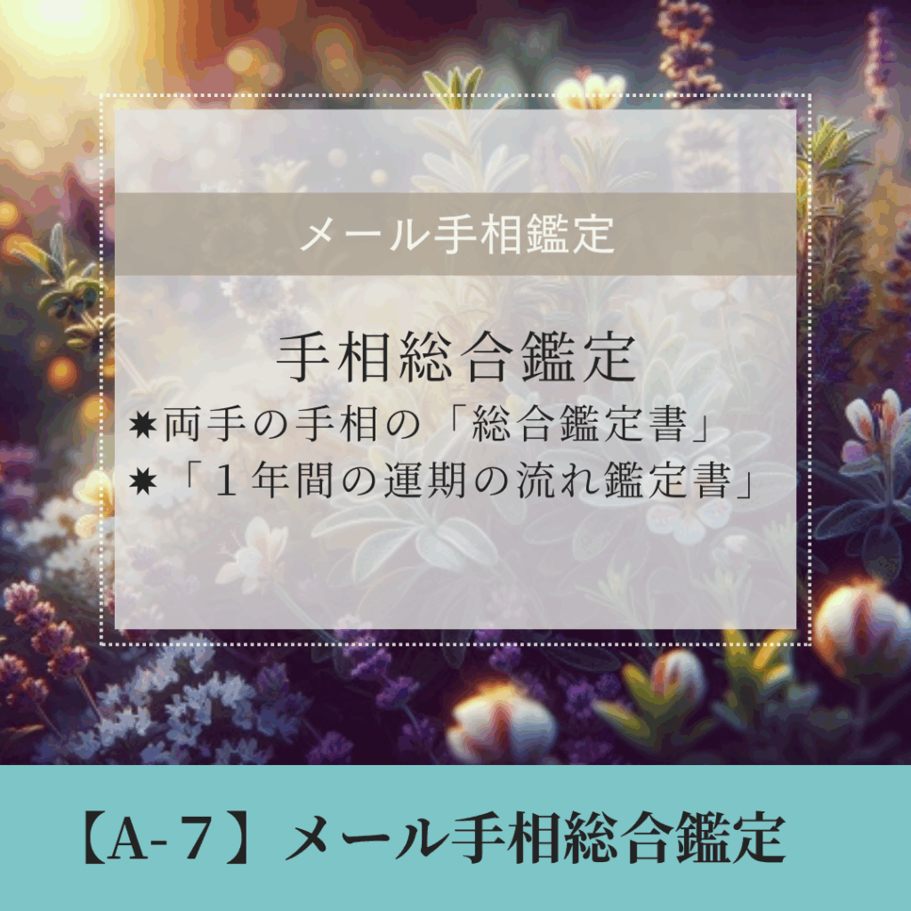 | 【A-7】手相総合鑑定(両手の手相総合鑑定書と1年間の運気鑑定書) | 1件 | 20,000円(税込) |
