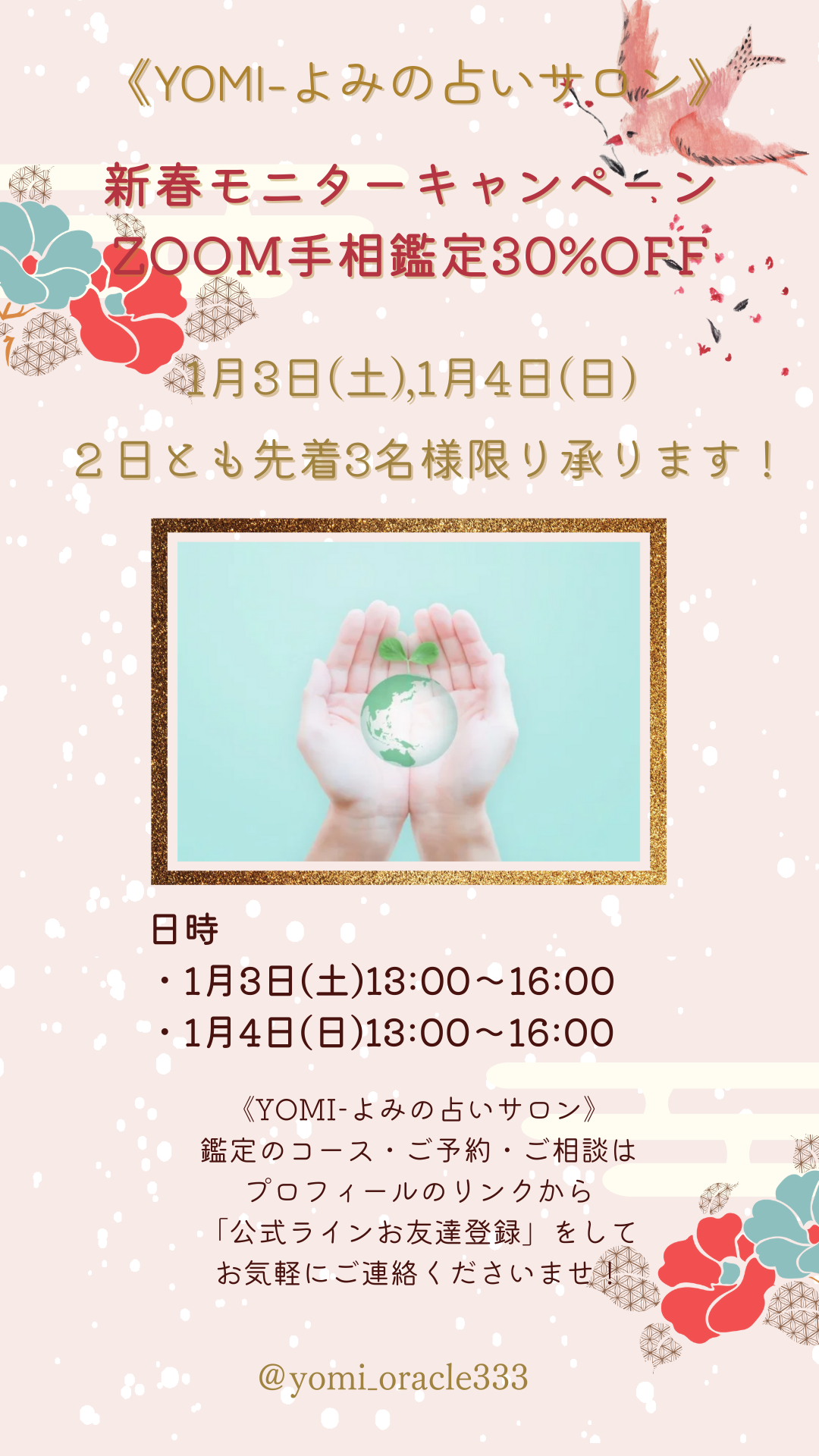 🌸1月3日と1月4日の2日間に各日3名様限り「ZOOM手相鑑定」の30分コースを30%OFFにて承ります!(簡易鑑定書もお付けしているお得なコースです)