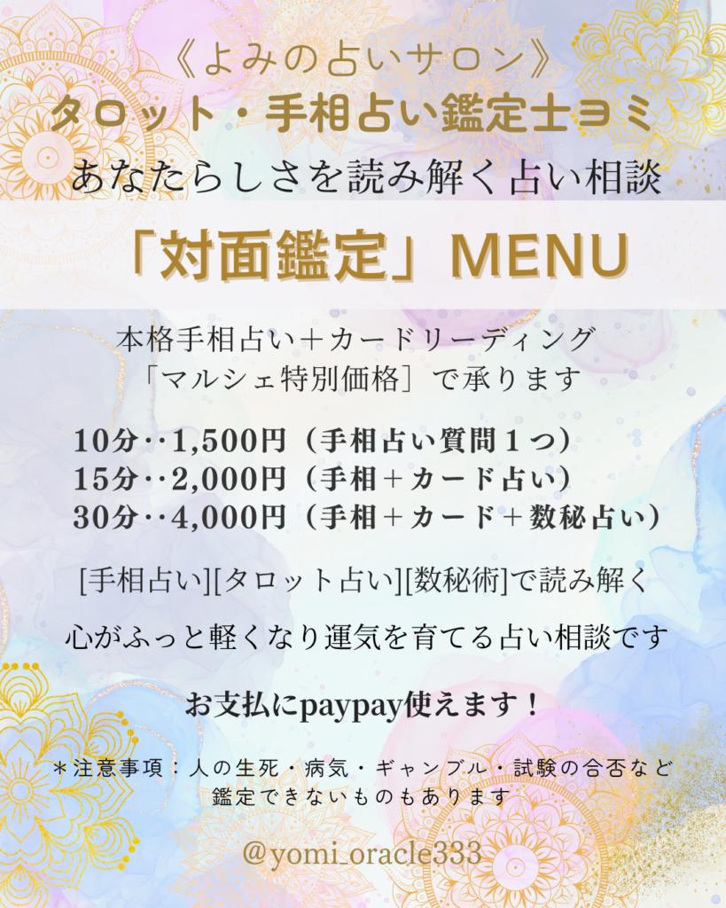 *注意事項:人の生死・病気・ギャンブル・試験の合否など鑑定できないものもあります。