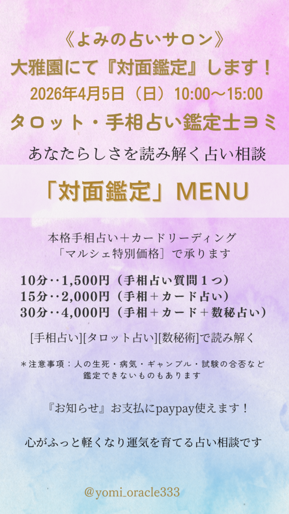 *注意事項:人の生死・病気・ギャンブル・試験の合否など鑑定できないものもあります。